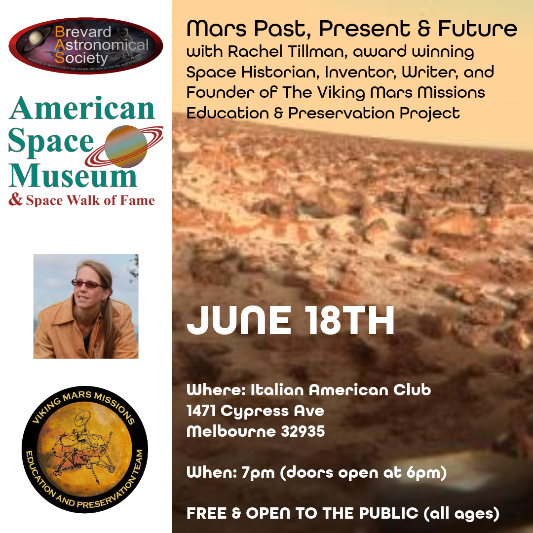We’re thrilled to feature our very own Rachel Tillman this Wednesday, June 18, at the Italian American Club (1471 Cyprus Avenue, Melbourne, FL). Rachel—an AIAA Associate Fellow and historian—will share her inspiring journey preserving NASA’s Viking Mars Lander hardware and artifacts, and how she’s bringing them across the country to spark public passion for space exploration