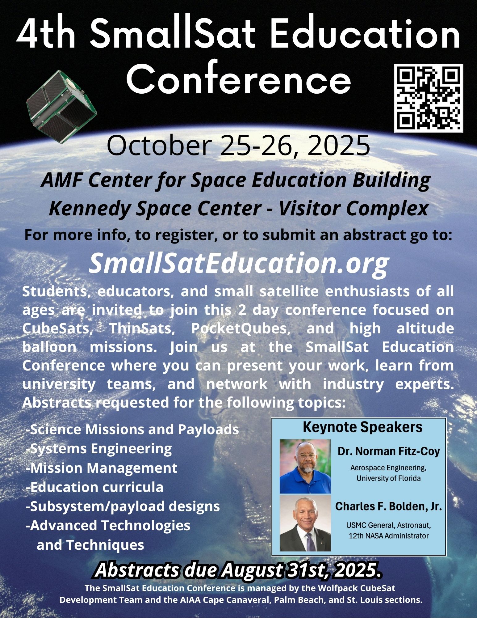 The SmallSat Education Conference returns to the Center for Space Education at Kennedy Space Center Visitor Complex for a weekend of learning, networking, and hands on sessions focused on small satellites and space education. Expect an audience of educators, students (middle school through graduate), university researchers, space professionals, and companies—~1,000 attendees expected (600 in 2024).