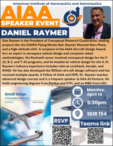 Introduction to Aircraft Conceptual DesignDaniel RaymerMonday, 14 April 20255:30pm Check in, 6pm StartFREE but RSVP requested for in-person, AIAA Young Professional Event!Hybrid Event - UT Arlington, SEIR 194 & Microsoft Teams 655 W Mitchell St, Arlington, TX 76010Register for in-person: https://aiaa-uta.square.site/product/dan-raymer-s-introduction-to-aircraft-conceptual-design/56?cp=true&sa=true&sbp=false&q=falseTeams Link: https://teams.microsoft.com/l/meetup-join/19%3ameeting_MTM3NjQ0N2YtZmE2OS00ZTg4LTkxNDMtNDZjMTU3MWIwNWI5%40thread.v2/0?context=%7b%22Tid%22%3a%225cdc5b43-d7be-4caa-8173-729e3b0a62d9%22%2c%22Oid%22%3a%222b376eeb-ddcc-4d84-8617-63a8ef1e57b0%22%7dUTA Parking info will be sent after reservation
