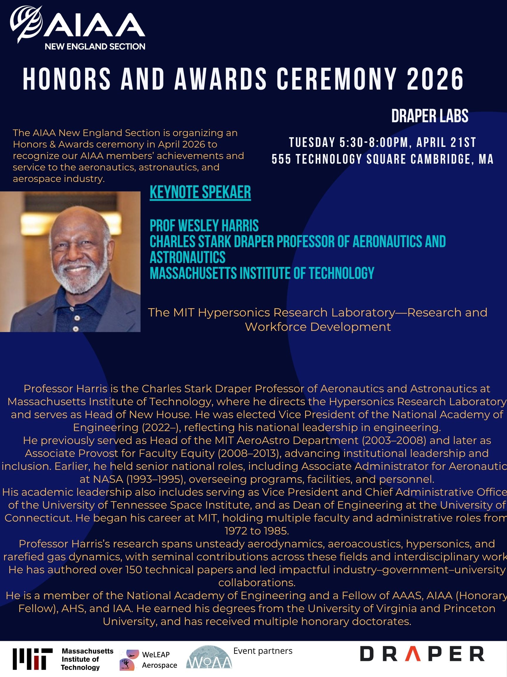 The AIAA New England Section is organizing an Honors & Awards ceremony in April 2026 to recognize our AIAA members’ achievements and service to the aeronautics, astronautics, and aerospace industry. Our program will be in April 2026 in the Boston area between 5:30-8:00pm. Each attendee will receive access to the awards program, dinner and reception.