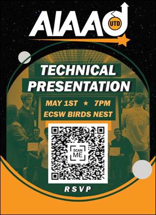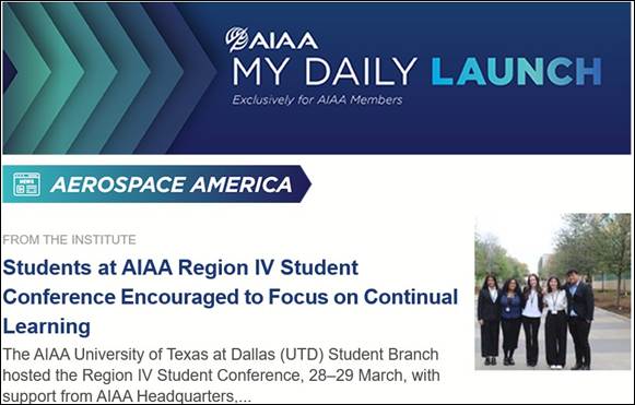 In case you missed it, the AIAA Region IV Student Paper Competition was the lead story for the AIAA international daily news My Daily Launch sent to all members on Friday 25 April (Aerospace America). Congratulations again to the UTD Student Chapter in hosting a great event!