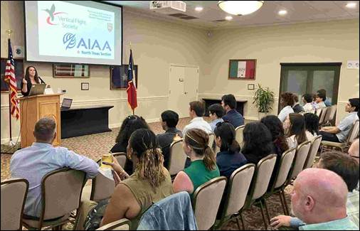 On 16 July at the Texas Star Golf Course, AIAA North Texas teamed with the Vertical Flight Society (VFS) Southwest Section to host a summer networking/social event for students, interns, young professionals, and all. Students were allowed to attend for free. Introductions were done by Dr. Elizabeth Ward from Bell (VFS Southwest President/AIAA Member), along with an AIAA welcome by North Texas Chair James Sergeant. Over 120 attended from AIAA & VFS with about 70 professional members and 50 students/interns. Dr. Troy Schank, Bell, presented Full Scale Stop-fold Transition Demonstration on a High-Speed Test Track about their recent sled test of a new concept for a foldable rotor to allow even higher-speed flight to be attained. Dr. Schank also mentioned the recent award to Bell to build a flight vehicle in the next few years to further demonstrate the potentials for this technology. Networking occurred before and after the presentation with heavy hors d'oeuvres and a cash bar.