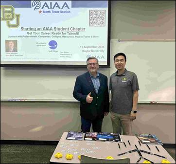 On 15 September, Baylor Associate Professor Dr. Liang Sun, Baylor Department of Mechanical Engineering Associate Professor (above right), hosted North Texas Chair James Sergeant for a presentation on the benefits of a student branch, which included making connections with professionals, companies, other colleges, resources, rocket teams as well as hosting program and noted speakers. Baylor is just starting the process, with Dr. Sun as their sponsor, who has already led several Baylor students to present papers at this year’s AIAA SciTech and Aviation and next year at SciTech once again. New student section applications opened in September with a deadline of 14 November. 15 students members are required along with an application which can be found at https://aiaa.org/get-involved/university-students/student-branches/#faqs. About 20 interested students attended with free pizza provided. Presentation charts from the meeting are available on the AIAA North Texas App Luft Orgs, under the Baylor logo.