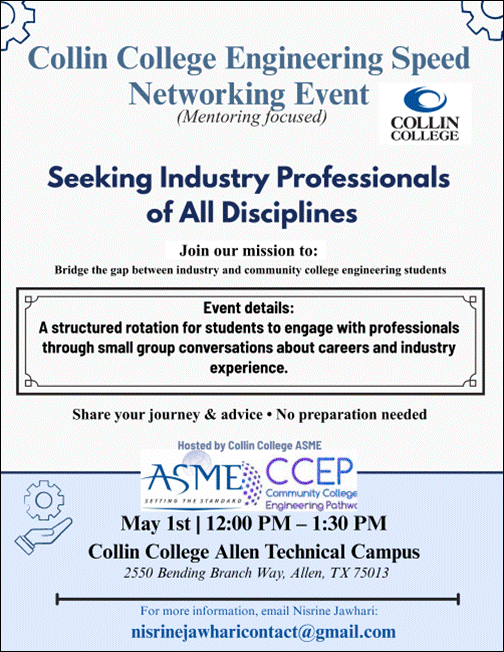 Collin College Engineering Speed Networking Mentoring Event, Collin College Technical Campus, 12:00-1:30pm, Contact/Volunteer