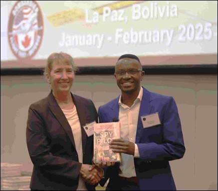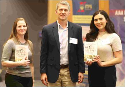 Retired Virgin Galactic astronaut and current/first woman SETP President, Kelly Latimer (F), served as the morning session chair. Shown above presenting the speaker’s gift Spy Pilot, autographed by author Gary Powers, Jr., to UTA BSAE graduate Brian Nyaberim from Bombardier for his presentation High-Altitude Airport Operations (HAAO) Testing Lessons Learned.