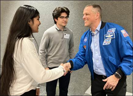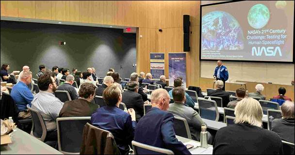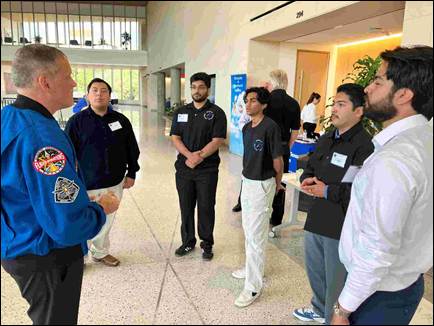 Keynote address from NASA Astronaut Bob “Farmer” Hines (M) “NASA’s 21st Century Challenge: Testing for Human Spaceflight” described in detail NASA’s plans for the upcoming return to the moon in the next few days with the Artemis program. Above, Farmer discusses his previous experience, having spent 6 months on the ISS space station in 2022, with UTA students.